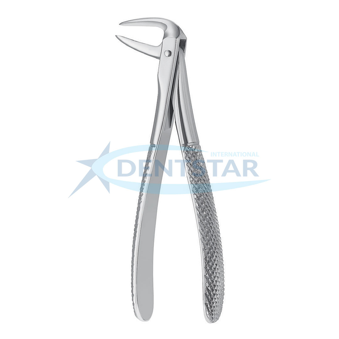 Extracting Forceps English Pattern Fig. 233 is a staple in mandibular oral surgery. Its unique geometry—part of the Hawk’s Bill family—is specifically optimized for the retrieval of lower root tips. Unlike standard molar forceps, the beaks of the Fig. 233 are designed to remain parallel at the tip, ensuring maximum surface contact with the root even under heavy pressure. At Dentstar International, we hand-finish every instrument in Sialkot to ensure the hinge tension and beak alignment meet the highest surgical standards.