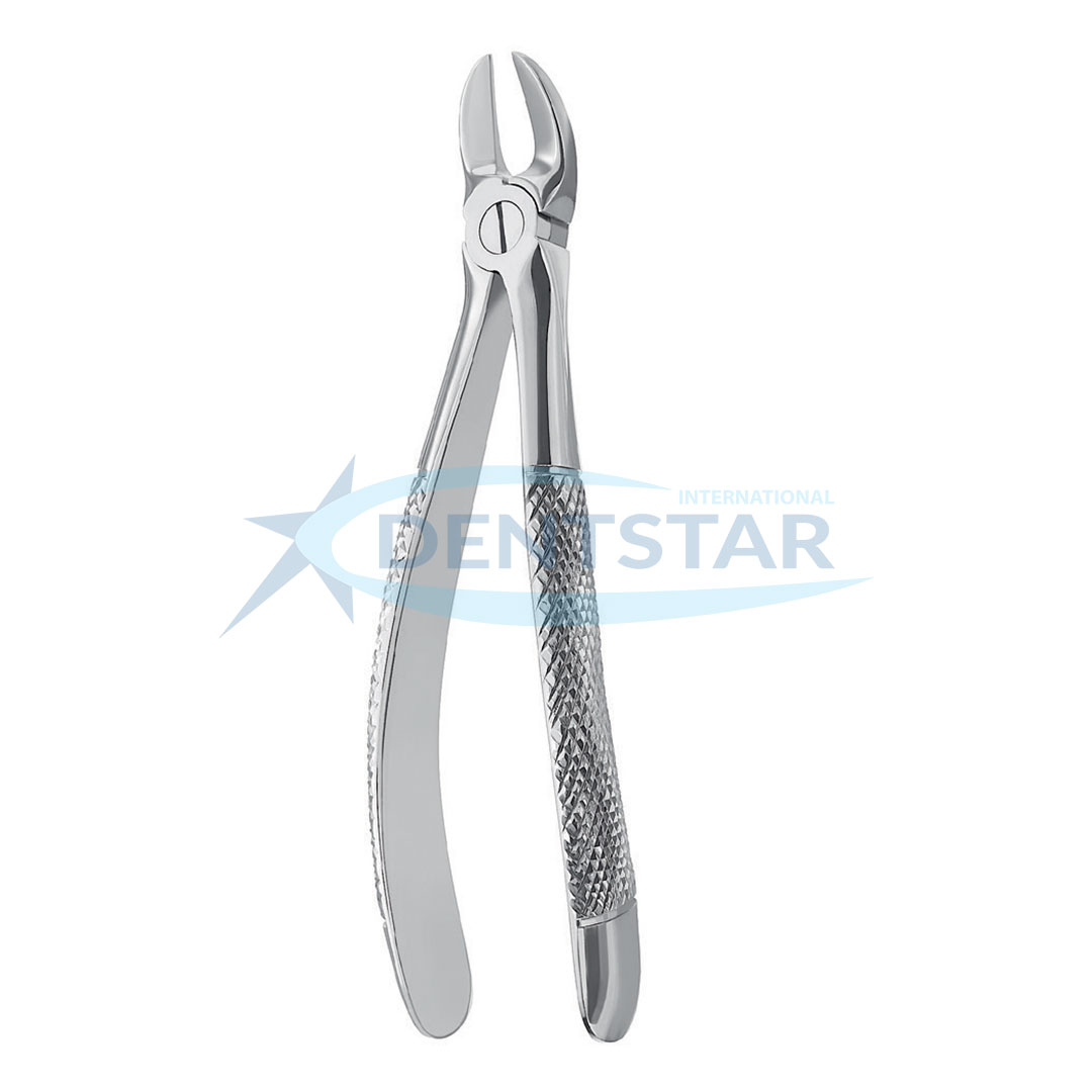 Extracting Forceps English Pattern Fig. 55 is a specialized tool in oral surgery, meticulously crafted for the removal of maxillary molars with complex forked root systems. Its anatomical geometry allows for an optimal fit on the tooth crown, ensuring an efficient and atraumatic extraction. At Dentstar International, we ensure every instrument is hand-finished in Sialkot to meet the highest global standards for healthcare professionals.